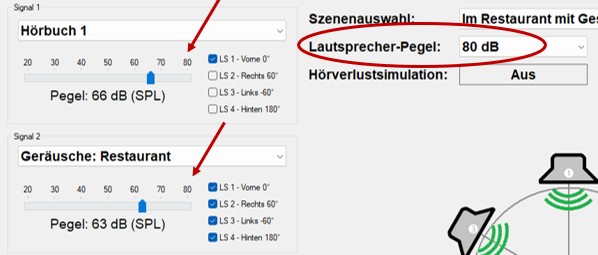 Stellen Sie zum Beispiel den Lautsprecher-Pegel auf 80dB, dann ergibt sich folgende Einstellung für die Signale: