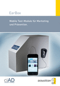 Broschüre "EarBox – mobile Testmodule für Marketing und Prävention" (entwickelt in Kooperation der ciAD AudioProducts GmbH und der Acousticon Hörsysteme GmbH für Hörgeräteakustiker, Berufsgenossenschaften, Arbeitsschutz ...), 4-seitig, Stand: 2016-09-30