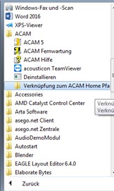 Das Verzeichnis befindet sich normalerweise unter C:\Programme (x86)\ACAM*. In diesem Verzeichnis befinden sich die Daten, die für den ACAM Betrieb notwendig sind. Ab Programmversion 5,9,10 vom 29.12.2010 wird ein weiterer Pfad angelegt. Sie erreichen diesen versteckten Pfad, indem Sie die Programmverknüpfung "Verknüpfung zum ACAM HOME Pfad" wählen (siehe untenstehenden Screenshot). Der effektive Pfad hängt vom Betriebssystem ab (siehe auch: Technische Informationen) und lautet: C:\ProgramData\Acousticon\ACAM\ Hier sind die Benutzerdaten abgelegt (z.B. Benutzerprofile) und die ACAM Lizenzdatei, die von besonderer Bedeutung ist.Letztere ist besonders wichtig, da sie alle Kalibrierungen enthält. Die Lizenzdatei wird automatisch erzeugt, wenn sie ACAM_Kal.exe mit Adminstratorrechten starten. |