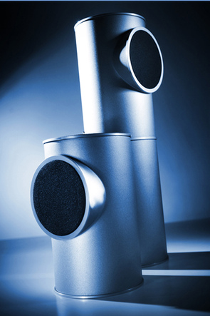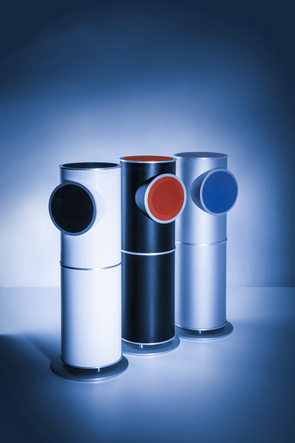Alle Schallaustrittsöffnungen (unten, oben und vorne) sind mit eloxierten Aluminiumringen und Akustikstoffabdeckungen versehen. Standardmäßig erfolgt die Lieferung mit schwarzen Akustikstoffabdeckungen – auf Wunsch sind jedoch auch folgende Farben lieferbar: Weiß, Beige, Grau, Blau, Gelb und Rot.